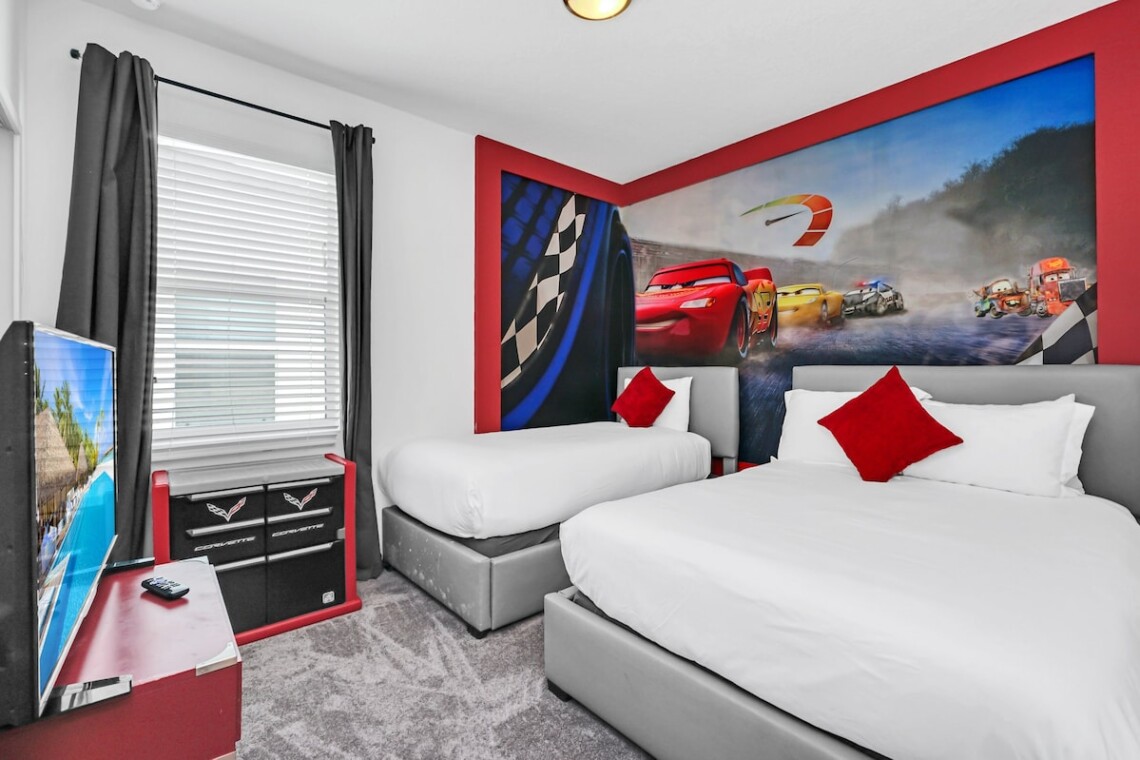 – Bedroom 4 (Cars Theme): Two full beds with playful décor.