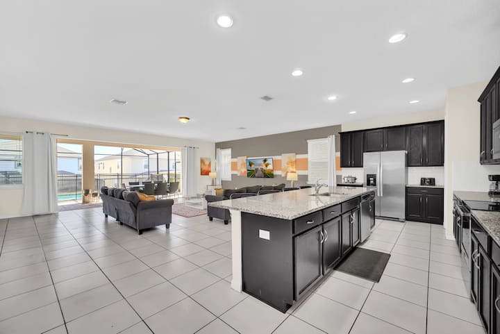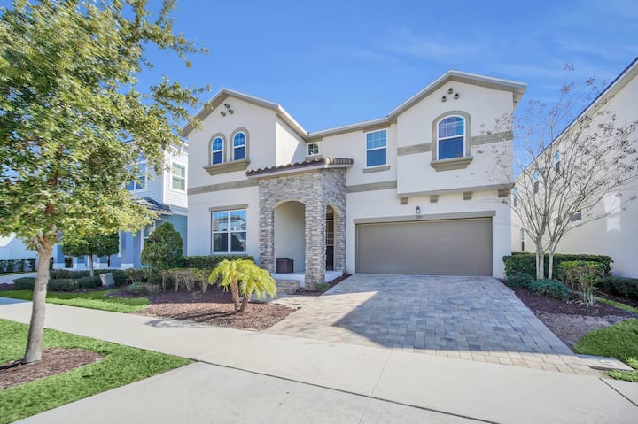 Spacious 9-bedroom Kissimmee vacation home near Orlando’s top theme parks, perfect for families and large groups. Sleeps 19 guests comfortably with private bedrooms and open living spaces. Around 30 minutes to Disney World, Universal Studios, Epic Universe, LegoLand, SeaWorld, and Disney Springs. Resort-style amenities include a heated pool, splash park, FlowRider surf simulator, gym, and sports courts. Ideal for family reunions, group trips, and extended Disney vacations.